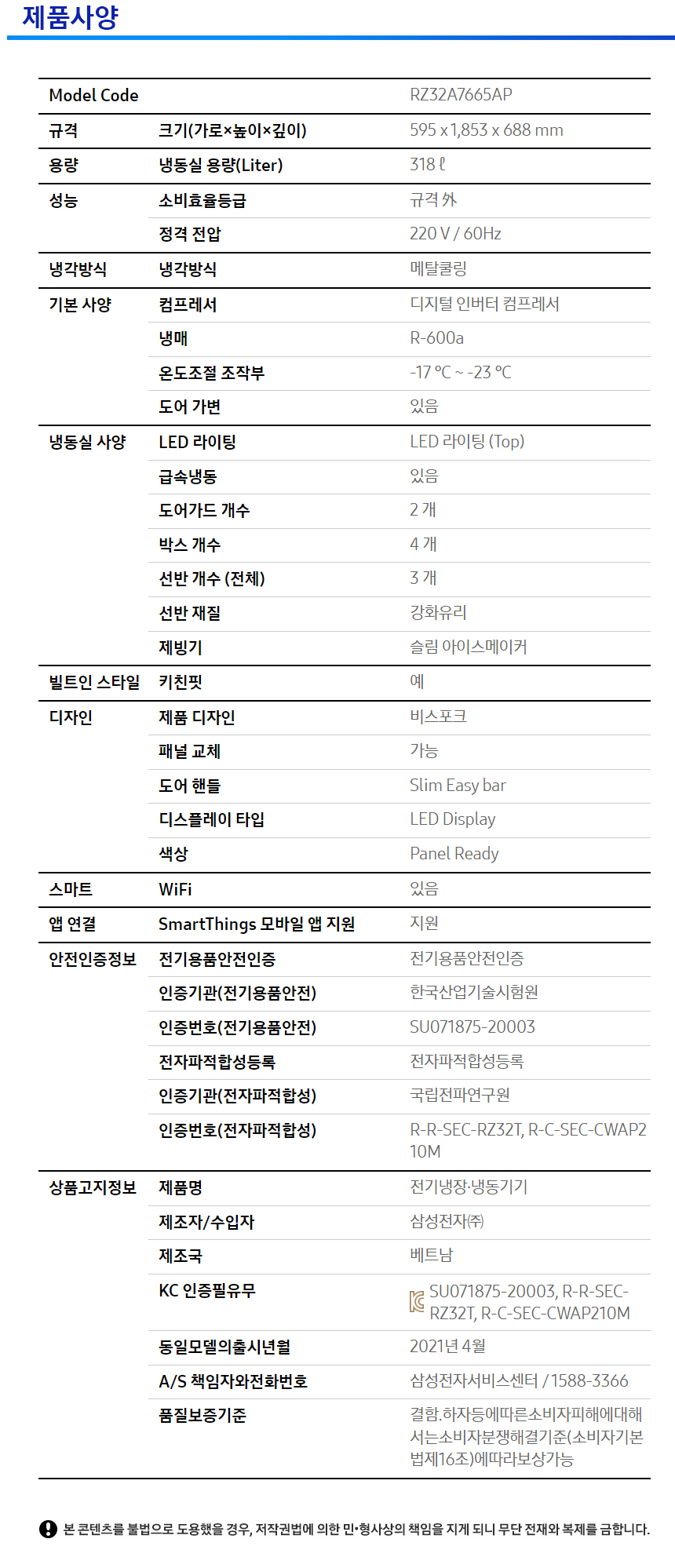 [렌탈] 삼성 비스포크 키친핏 빌트인 냉동고 1도어 RZ32A7665AP