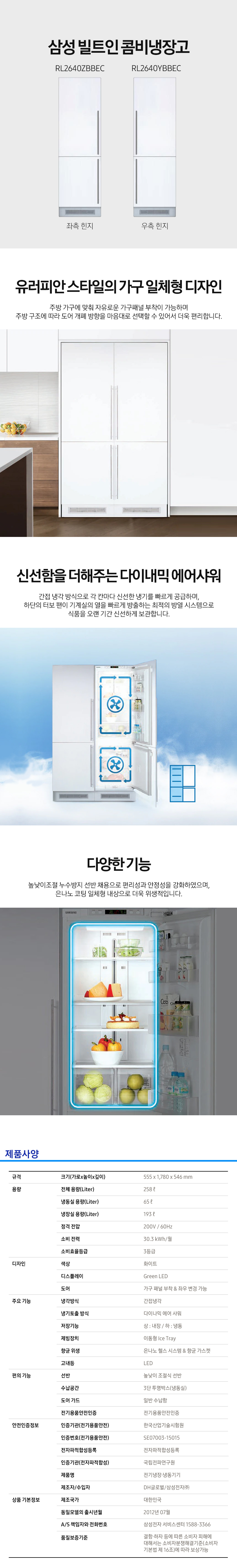 [렌탈] 삼성 빌트인 콤비 냉장고 258L RL2640YBBEC