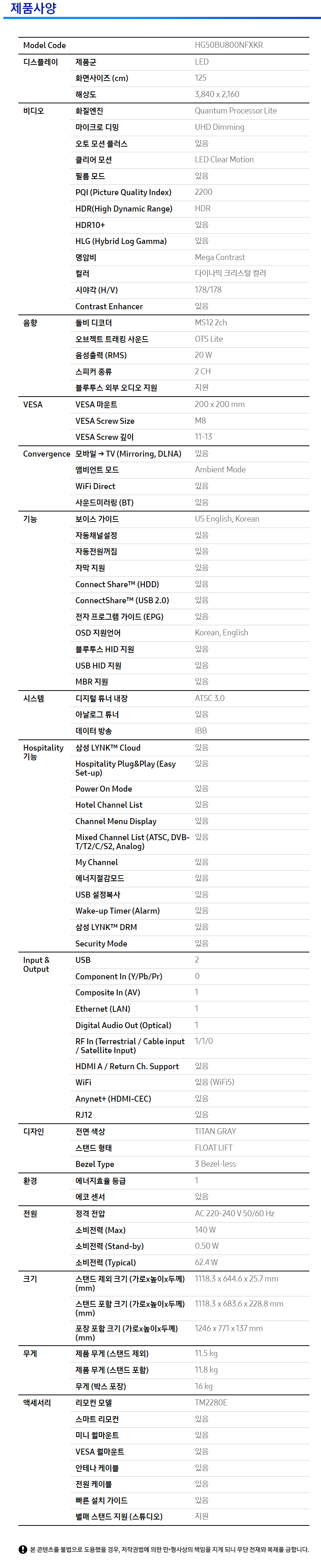 [렌탈] 삼성 호텔 비즈니스 TV 50인치 HG50BU800NFXKR
