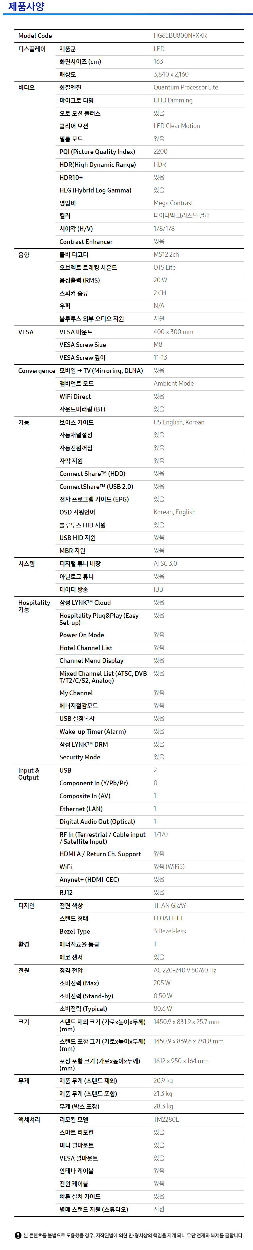 [렌탈] 삼성 호텔 비즈니스 TV 65인치 HG65BU800NFXKR