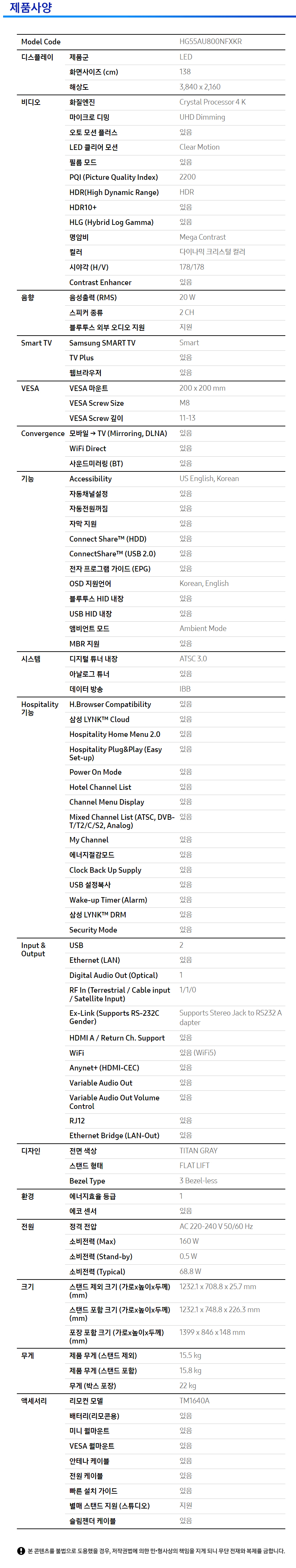 [렌탈] 삼성 호텔 비즈니스 4K UHD TV 55인치 HG55AU800NFXKR