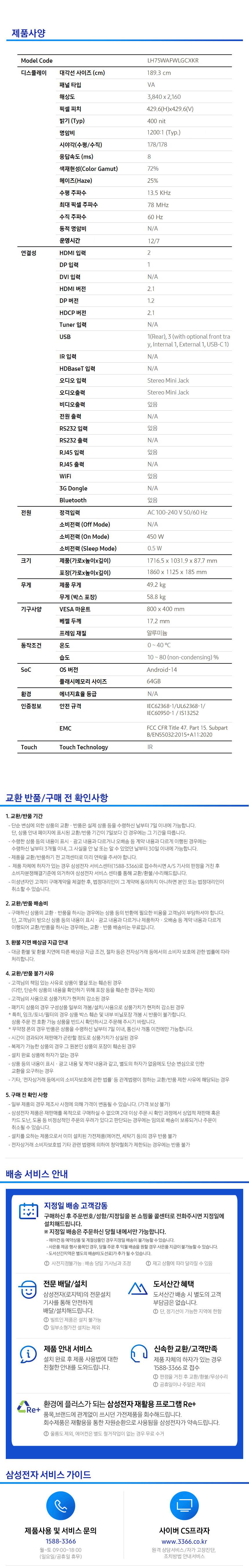 [렌탈] 삼성 안드로이드 전자칠판 WAD 75인치 UHD LH75WAFWLGCXKR