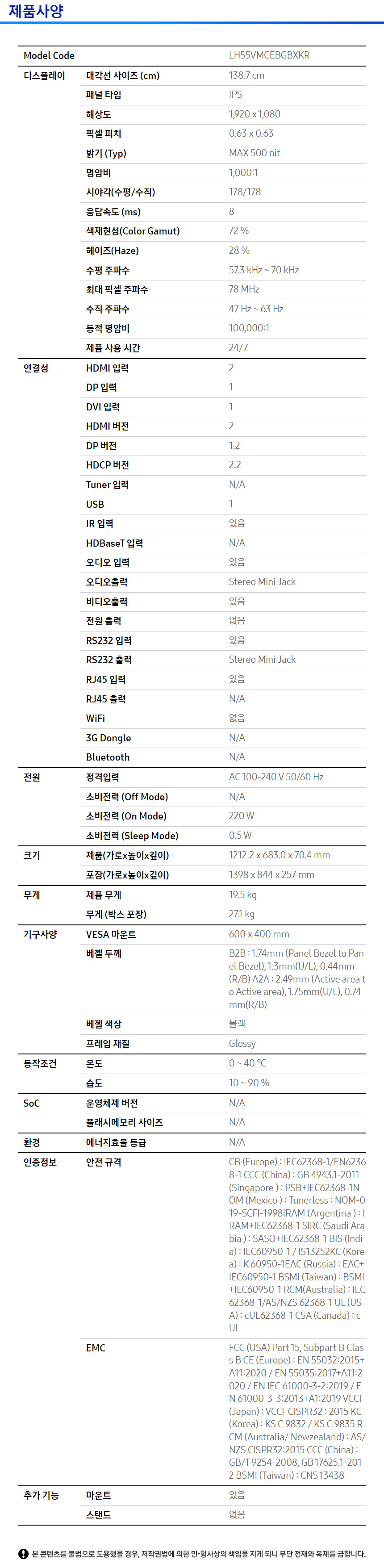 [렌탈] 삼성 비디오월 Extreme 베젤 1.74mm 시리즈 LH55VMCEBGBXKR